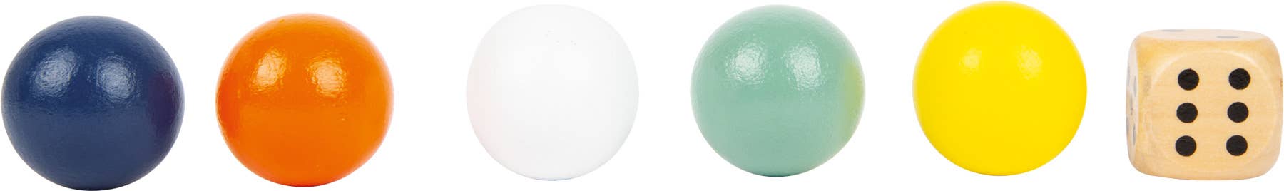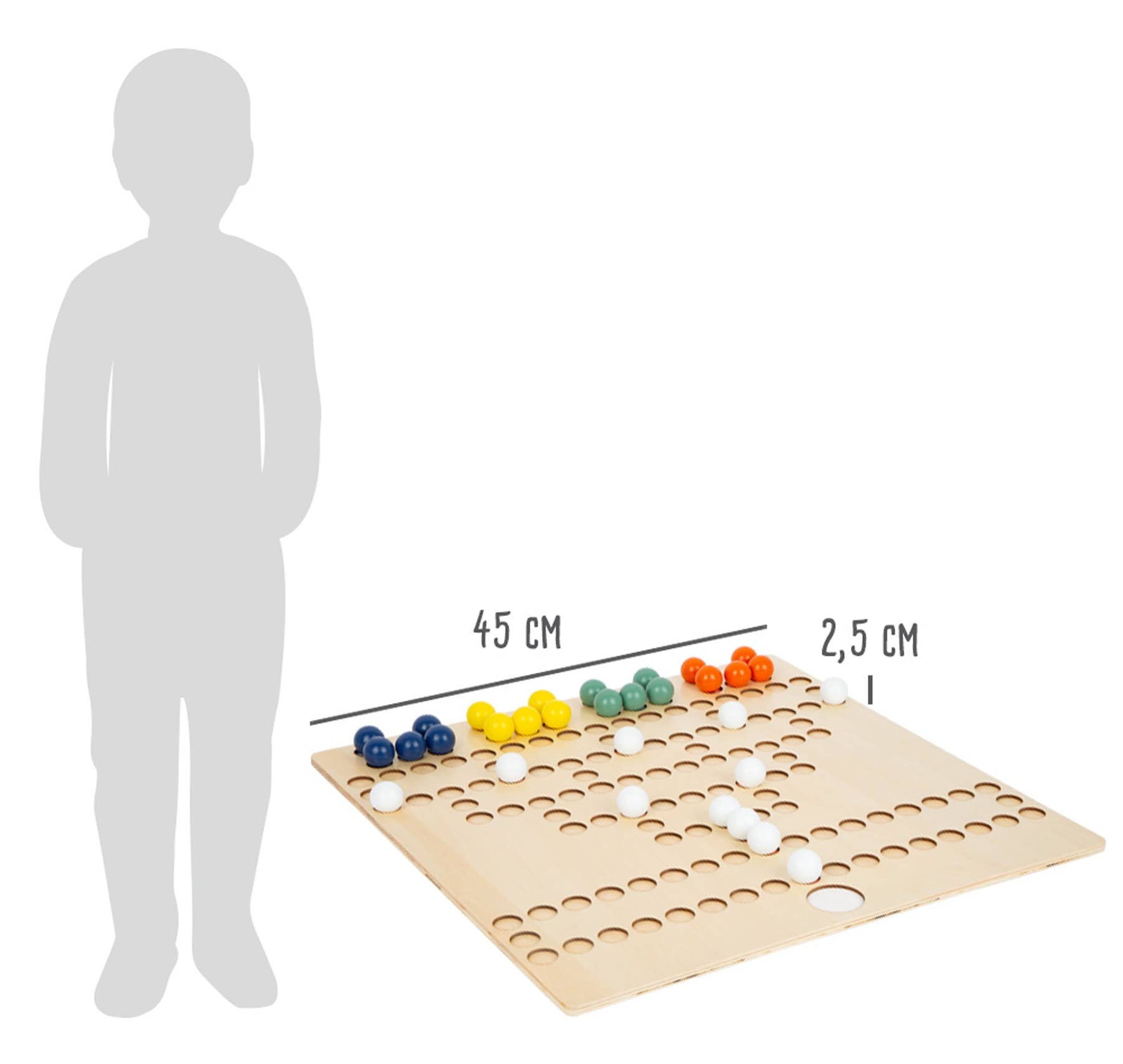 Spänning, tur och taktik! I detta klassiska träbrädspel i XL-format måste du sätta upp barrikader, kasta motståndare ut och hitta det taktiskt bästa sättet att nå målet. Men se upp: Spelare kan blockera vägen med vita bollar! Den extra stora spelplanen och utskärningarna för spelbitarna gör det enkelt för spelare med små händer eller osäker handledning att placera bitarna. Levereras med tygpåse Kul för barn, föräldrar och morföräldrar! Vem får kläm på det och blockerar vägen för de andra spelarna? En nummerkub bestämmer utvecklingen av de färgade träbollar. De elva vita bollarna och fem bollarna vardera i orange, mintgrön, gul och blå kan säkert förvaras i den medföljande tygpåsen. Detta klassiska spel garanterar bra spelglädje och bör inte saknas i något spelskåp.