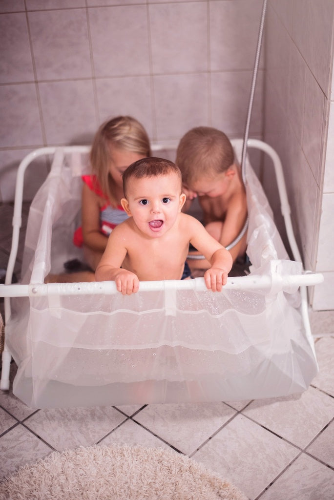 BiBaBad är tillräckligt rymligt för ett eller flera barn och passar från nyfödd upp till cirka 8 år. När det inte används, fälls det smidigt ihop och kan hängas på väggen. Med en praktisk avtappningsfunktion som placeras direkt över golvbrunnen är BiBaBad både hygieniskt och lätt att tömma.