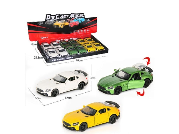 Häftig bil 12 cm i metall med pull back i 3 färger, vit, gul och grön.