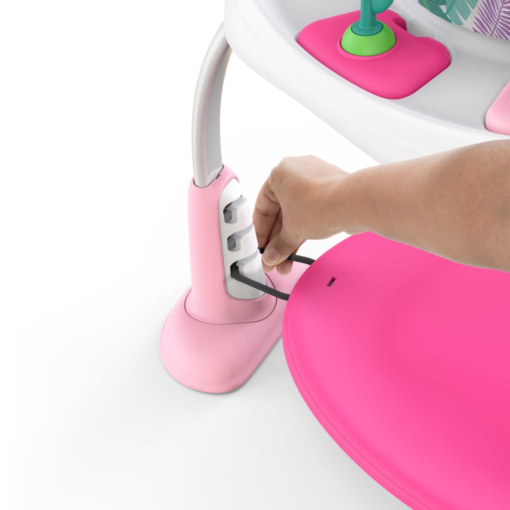 I hoppgungan kan du justera höjden i tre olika lägen, så att ditt barn kan hoppa i rätt höjd. Sittdynan roterar 360° för att ge enkel tillgång till alla leksaker och aktiviteter. Den elektroniska grodstationen spelar musik och gör roliga ljud, med lysande näckrosblad som fascinerar ditt barns sinnen.