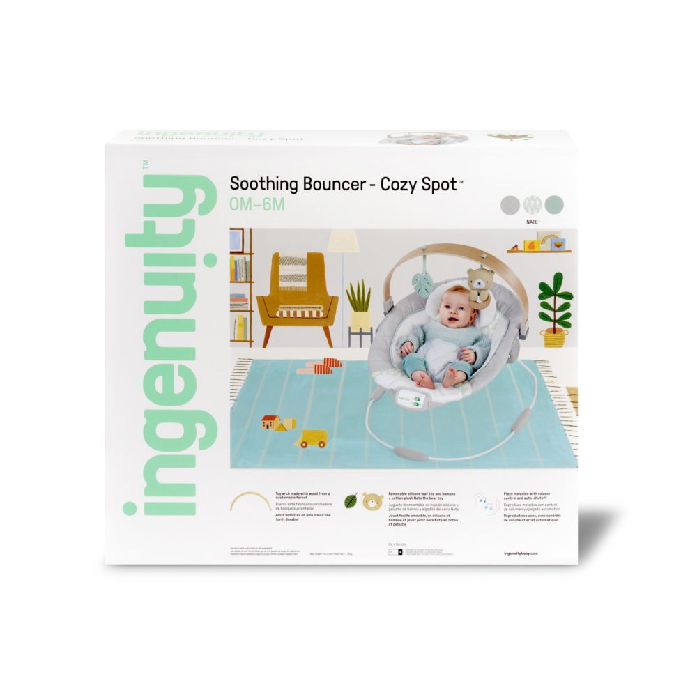Cozy Spot kommer med den söta Nate-björnen och en silikonleksak formad som ett löv. Dessa leksaker kan enkelt tas bort, vilket gör det lätt att ta med dem på resan. Babysittern spelar även melodier för att hålla din baby engagerad, med volymkontroll och automatisk avstängning för att du ska kunna styra ljudnivån.