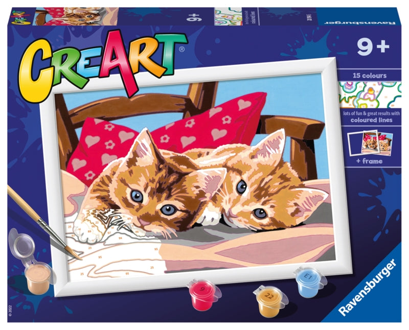 "CreArt Two Cuddly Cats" är ett exempel på ett av dessa fantastiska set. Med 15 akrylfärger, en hållbar finspetsig pensel, och en högkvalitativ tjock målarduk, får barnen alla verktyg de behöver för att skapa ett mästerverk. En lättföljd guide och en presentationsram ingår också, vilket gör det enkelt att visa upp det färdiga konstverket.
