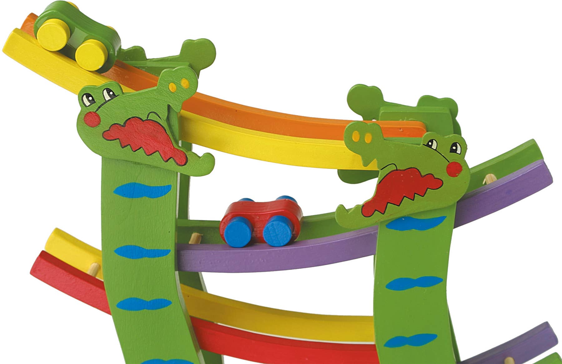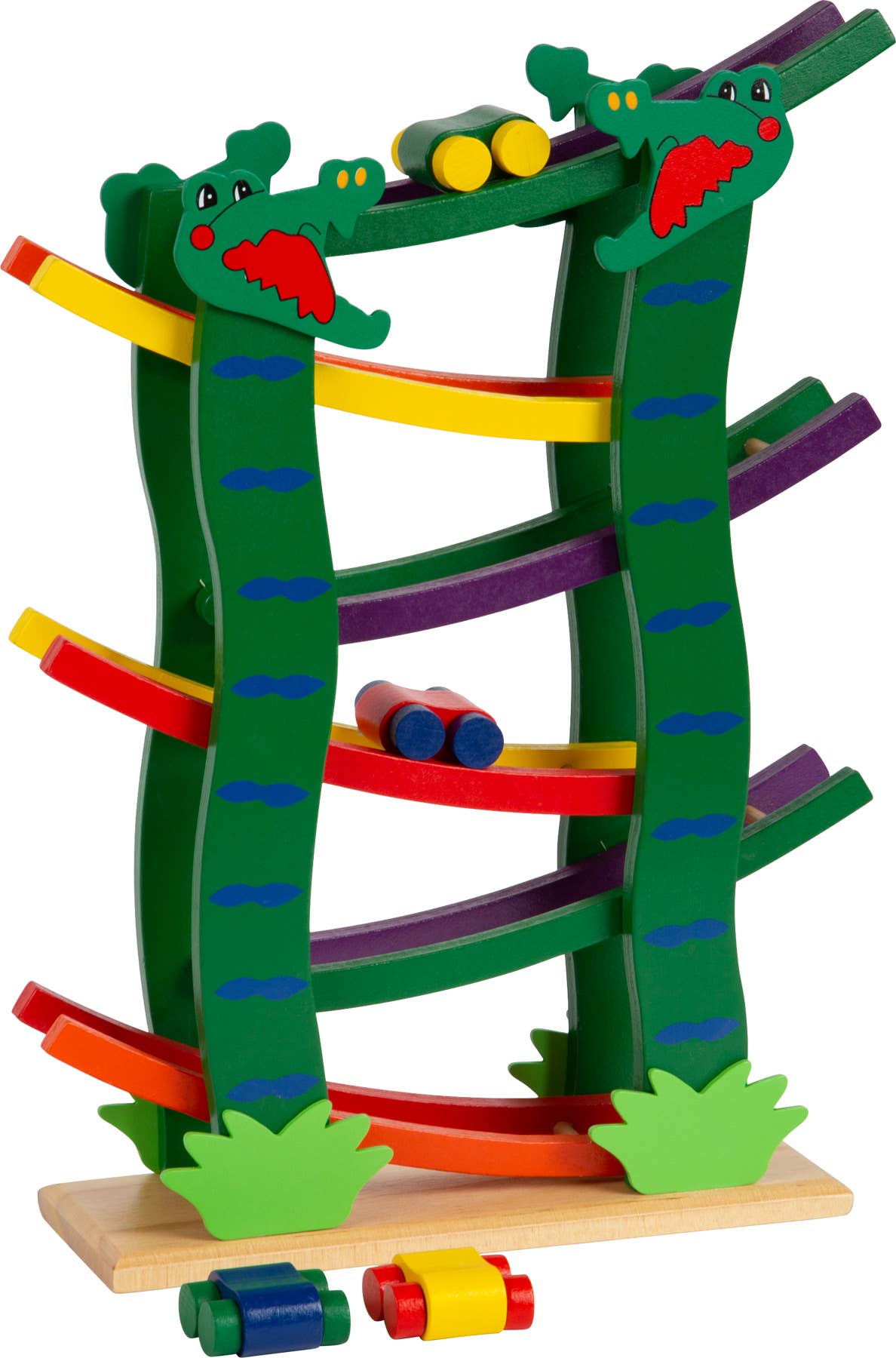 Låt oss gå! Denna roligt utformade träbana i stil med en marmorkörning är snabb. Det gröna spåret med sina bitande krokodilhuvuden inbjuder dig alltid att hänga upp och susa ner träbilarna. De fyra levererade bilarna rullar över i vardera änden av skenan så att de fortsätter upp och ner på den underliggande skenan. Snabba åtgärder med rollover-garanti! Barn kommer inte att få nog av detta krokodilspår när som helst snart.