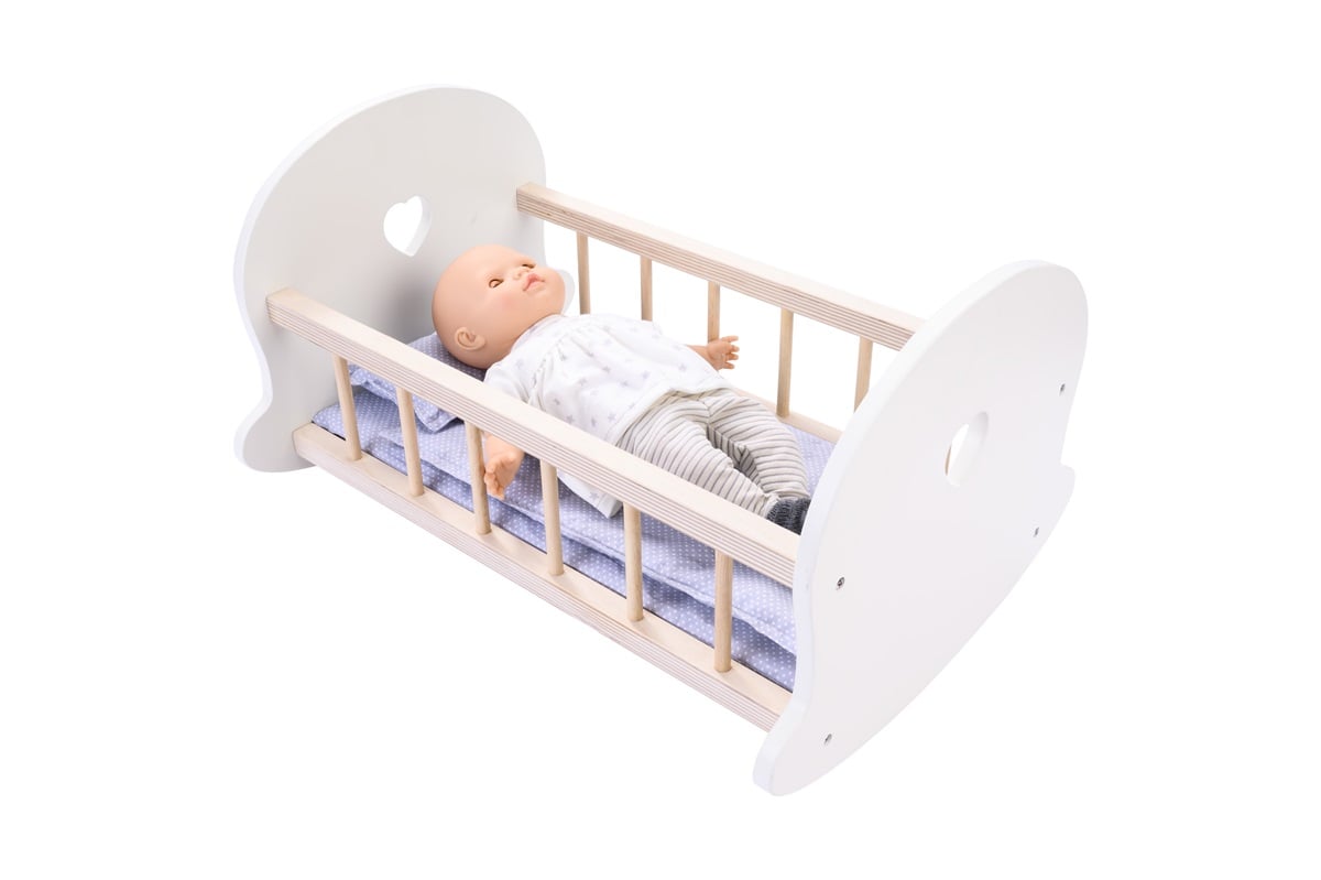 Denna docksäng levereras med en madrass, filt och kudde i grått och vitt, vilket gör den redo att användas direkt. Dessa tillbehör bidrar till en mysig och inbjudande miljö för dockorna, vilket gör leken ännu mer engagerande. Gungbädden är utformad för att passa alla dockor, vilket gör den till ett mångsidigt val för barnens leksakssamling.