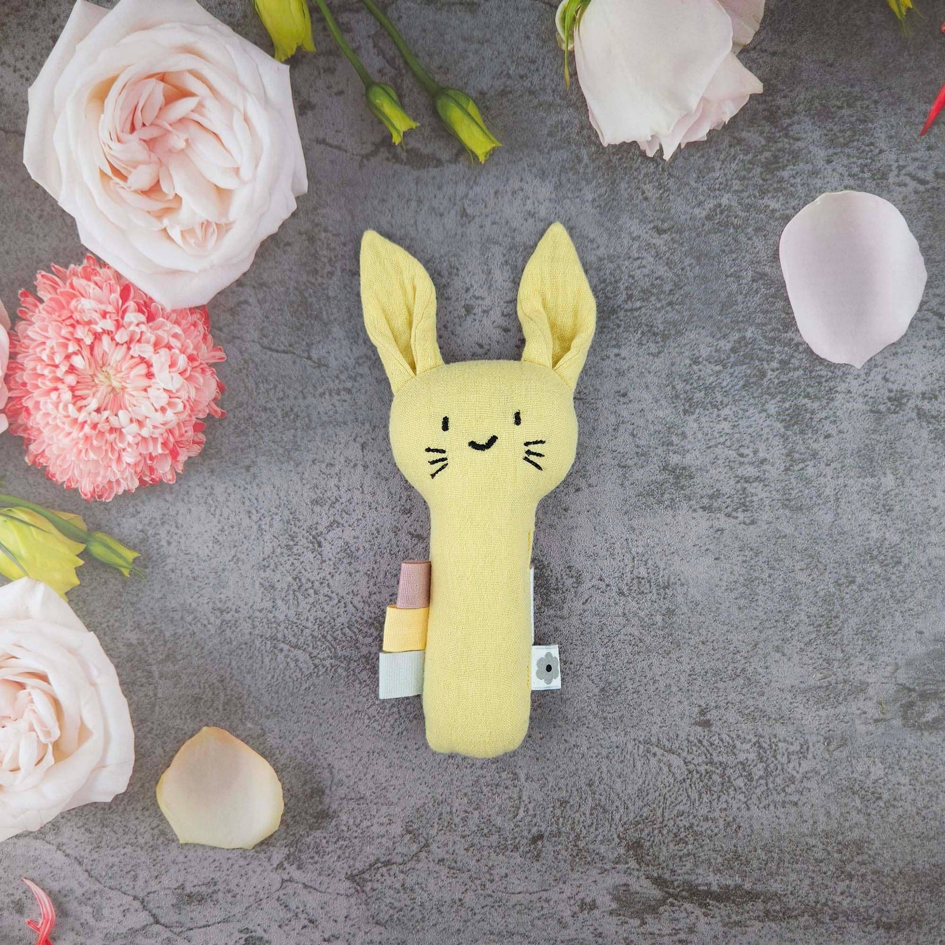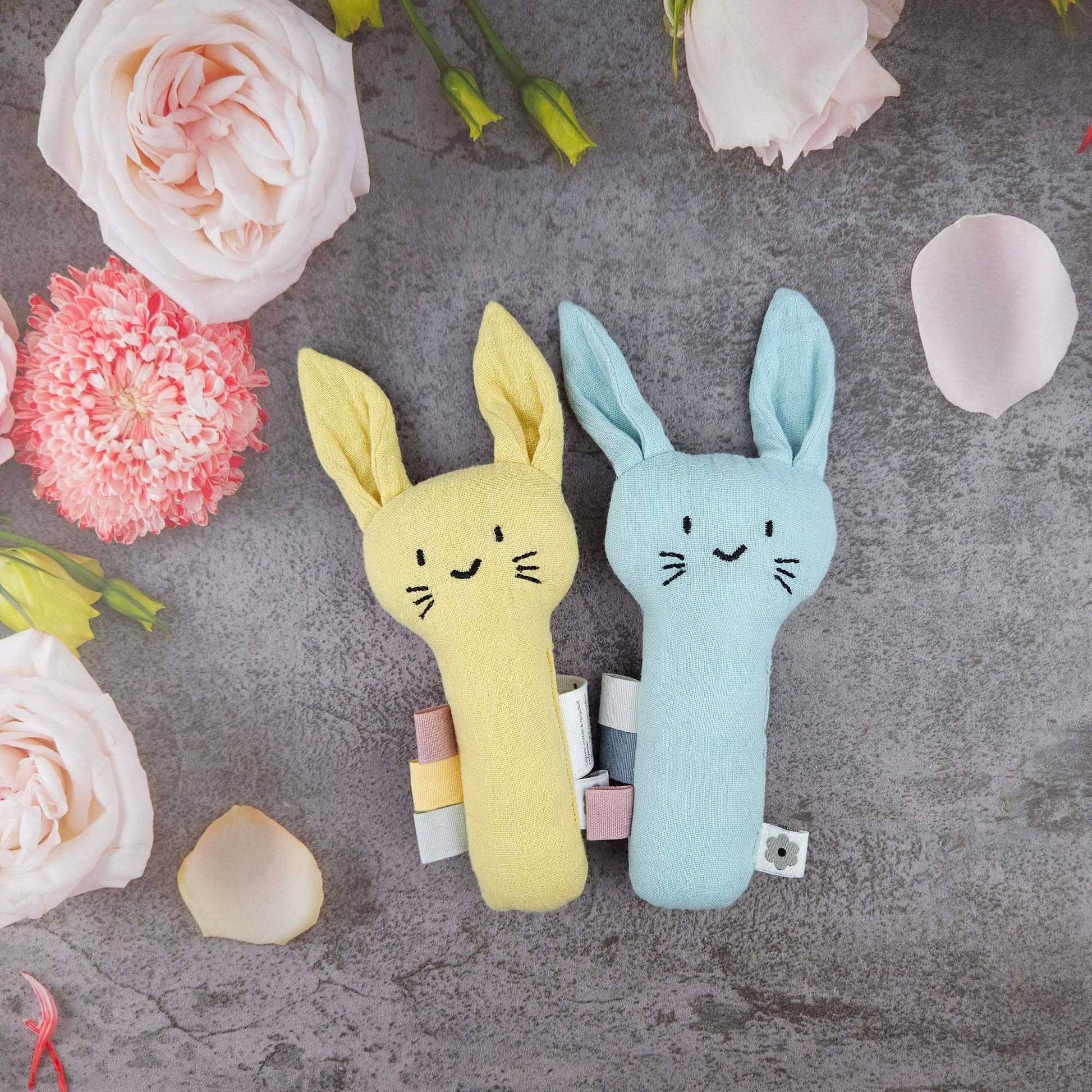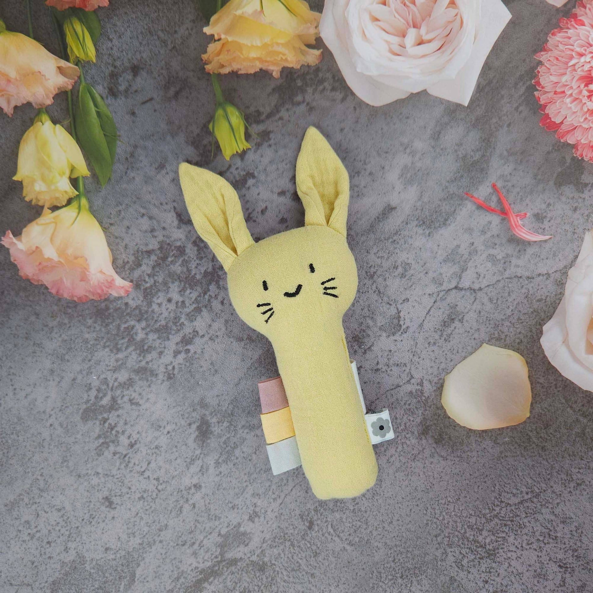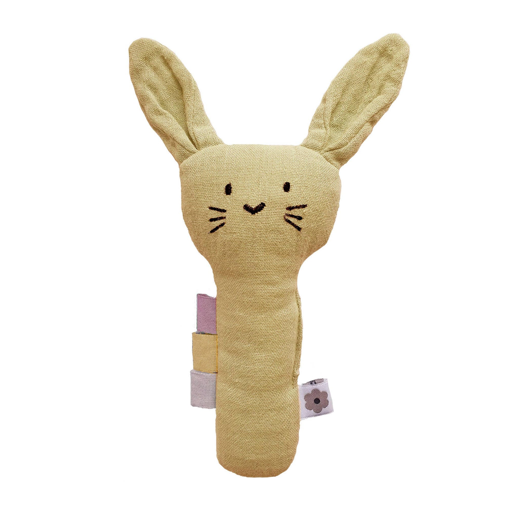 De långa kaninöronen och de små, färgglada taggarna på skramlan är särskilt designade för att stimulera barnets sinnen. Barnet kan utforska olika texturer och former, vilket bidrar till utvecklingen av deras taktila färdigheter. Inuti skramlan finns ett trevligt skallljud som aktiveras när den skakas.