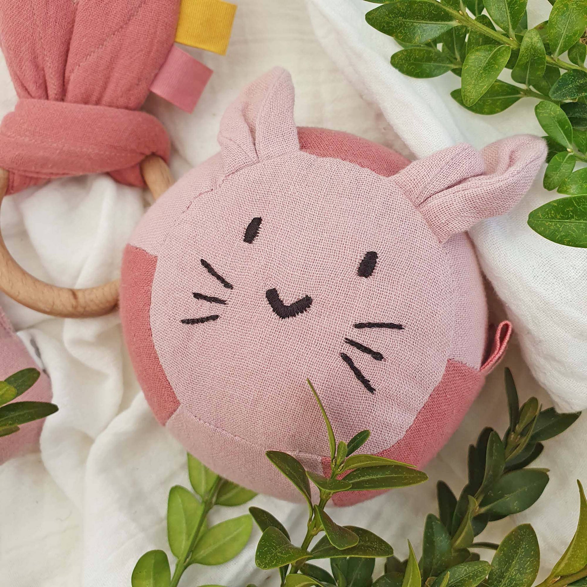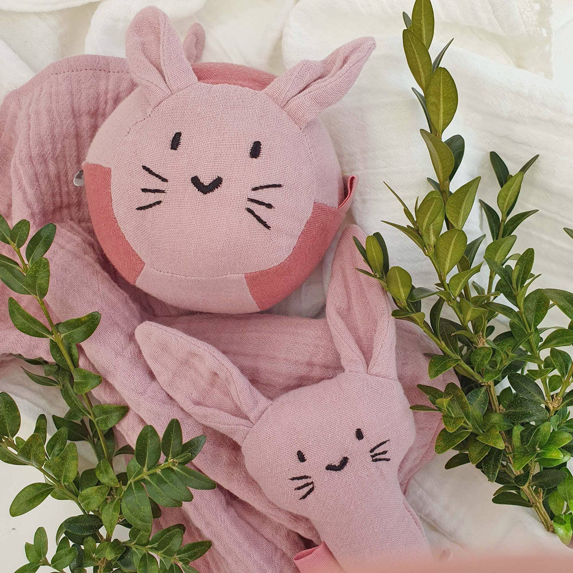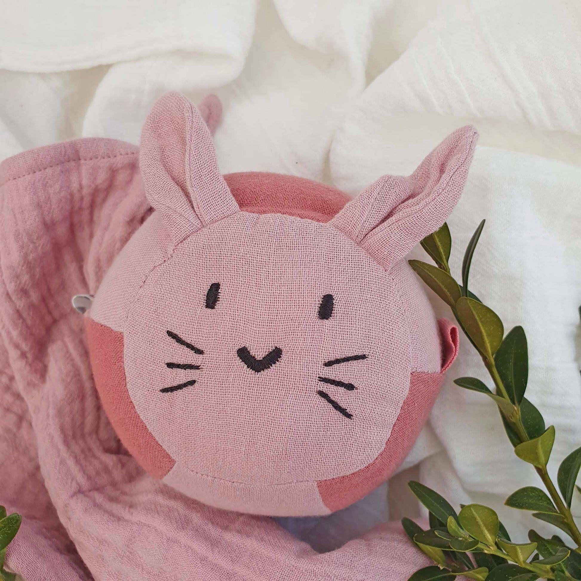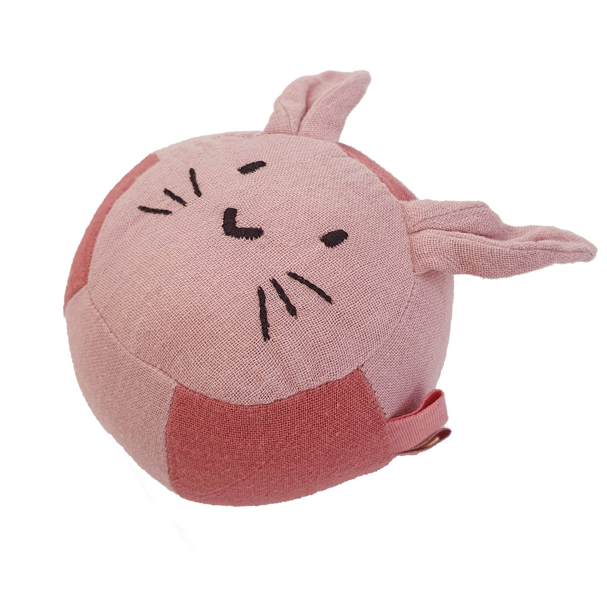 Summerville organic har skapat en söt kanin som fungerar som en mjuk, sensorisk skallboll för barnet att leka med. De långa öronen och de små färgglada taggarna är fascinerande för barnet att utforska. Inuti bollen finns en liten skralla som ger ifrån sig ett skramlande ljud vid lek.