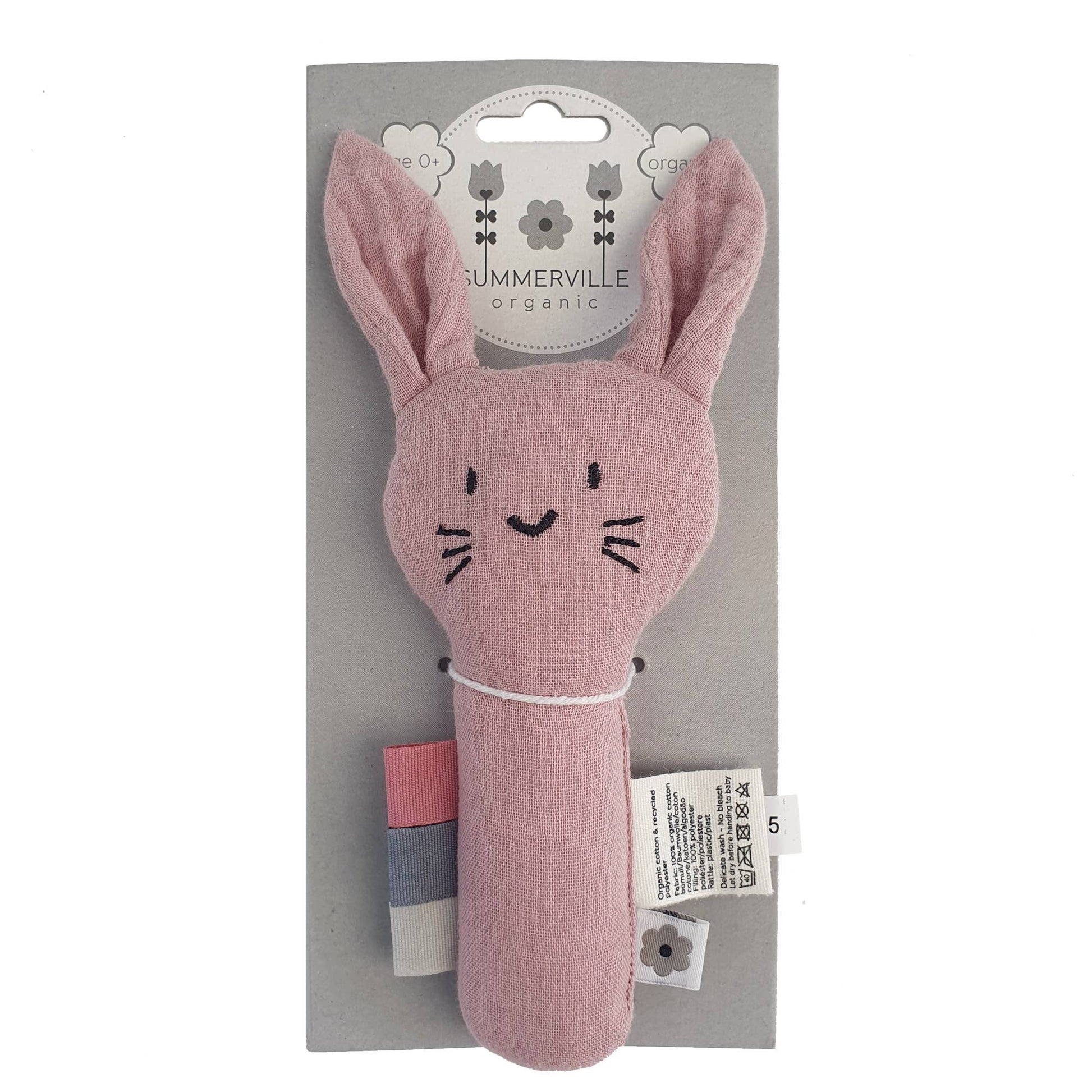 Summerville organic erbjuder en mjuk skramla tillverkad i ekologisk bomullsmuslin. Denna skramla är perfekt för små händer att utforska och känna på. Den är fylld med återvunnen polyester, vilket gör den både hållbar och miljövänlig.
