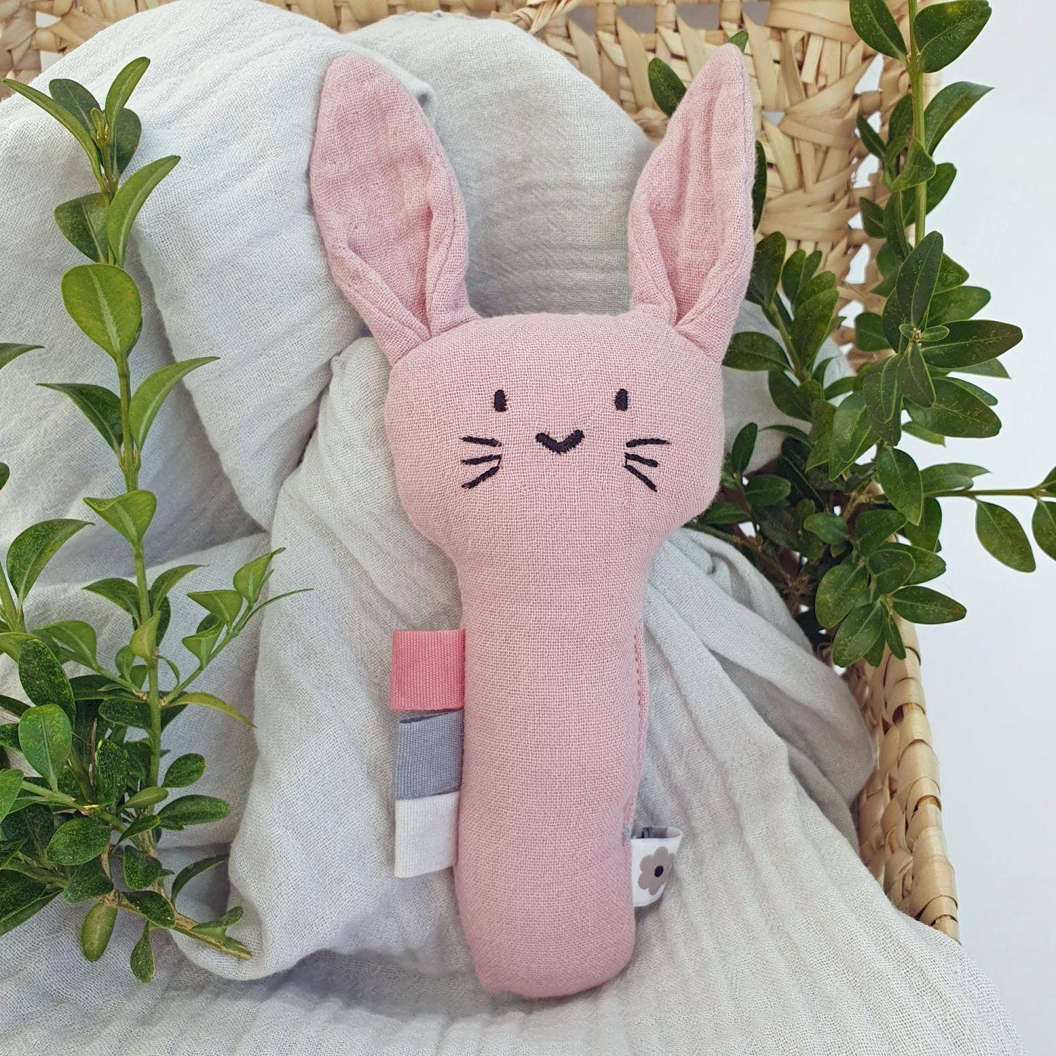 De långa kaninöronen och de små, färgglada taggarna gör denna skramla extra intressant för barn. Dessa detaljer uppmuntrar till lek och stimulans, vilket är viktigt för barnets utveckling.