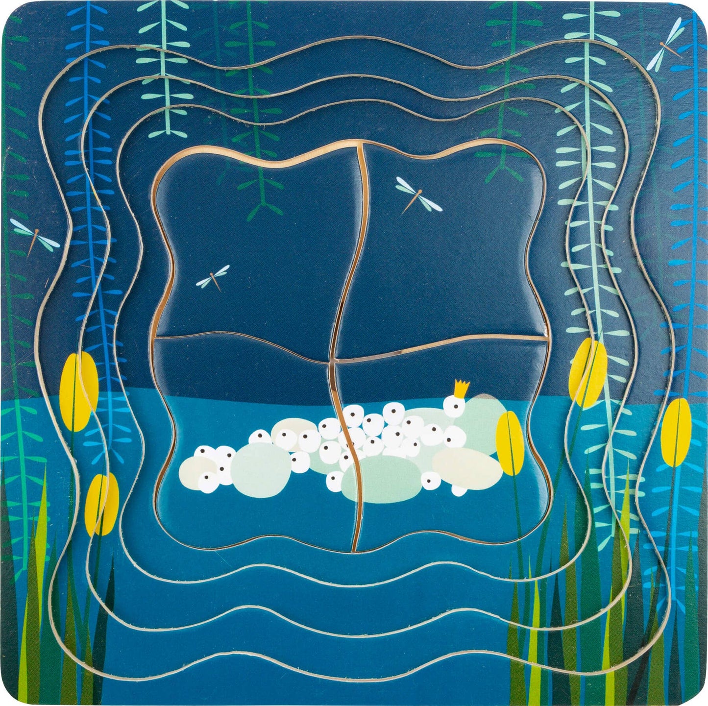 Med detta skiktade pussel, bestående av fyra lager, lär barn känna utvecklingen av en groda på ett lekfullt sätt. Från och med enkla 4 bitar i det första lagret kan små pusselfans fortsätta att träna sina färdigheter med varje ytterligare lager och 6 eller 9 pusselbitar. Förutom motorisk färdighetsträning är kunskapen ”förbryllad” längs vägen. Ett lärorikt, detaljerat pussel som är roligt för unga och gamla och förklarar hur grodägget blir en vuxen ”grodprins” över grodyngen.
