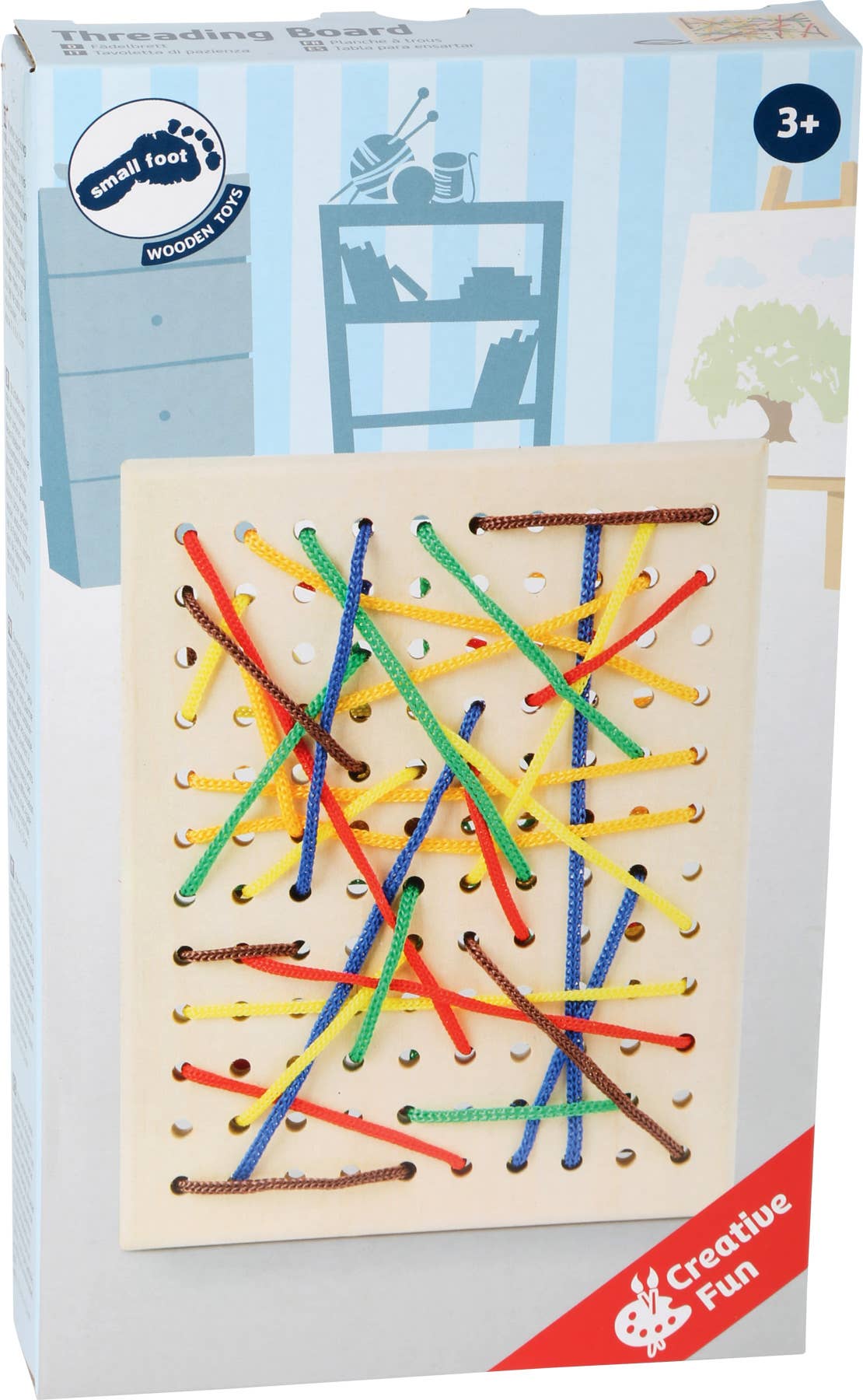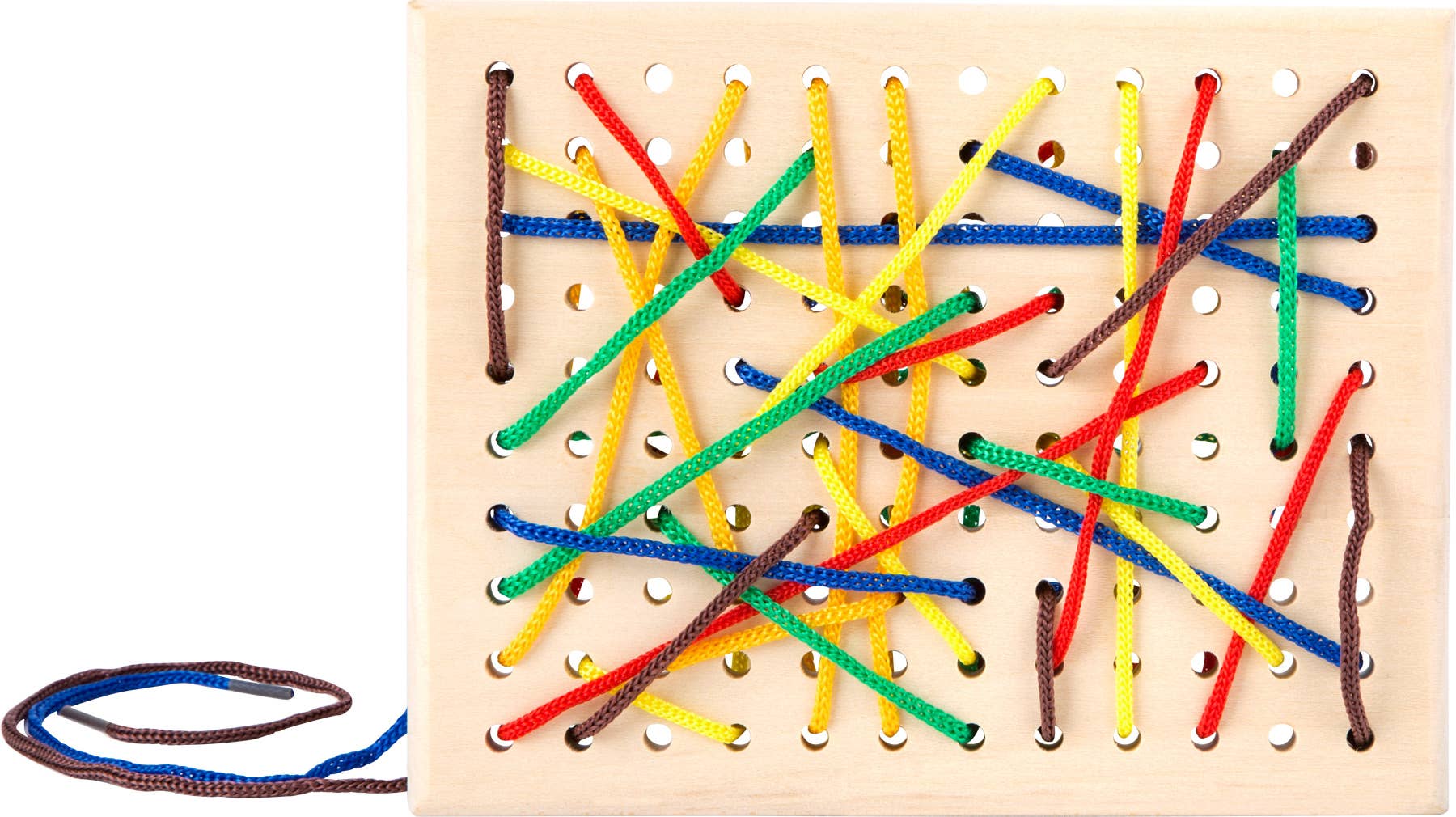 Vem håller reda på detta? Färgglada trådar kan införlivas i denna perforerade skiva. Oavsett om korsbädd eller olika mönster, kreativitet och fina motoriska färdigheter utbildas här. Också idealisk som förberedelse för att binda skosnören.