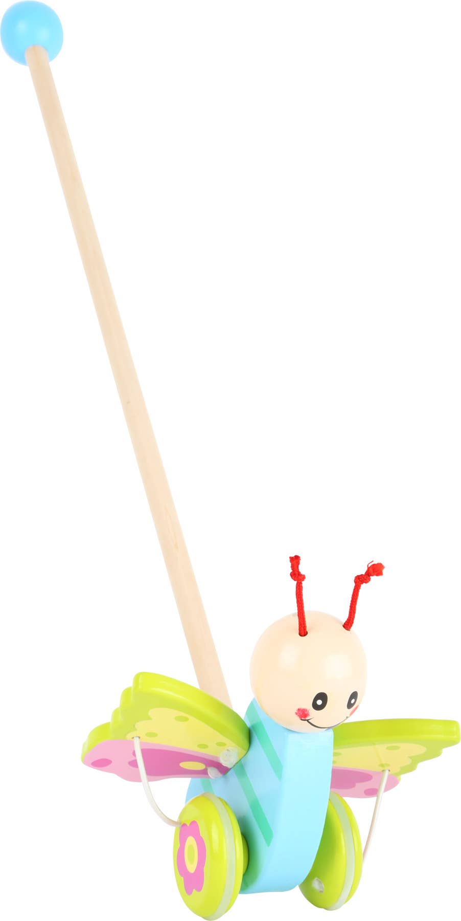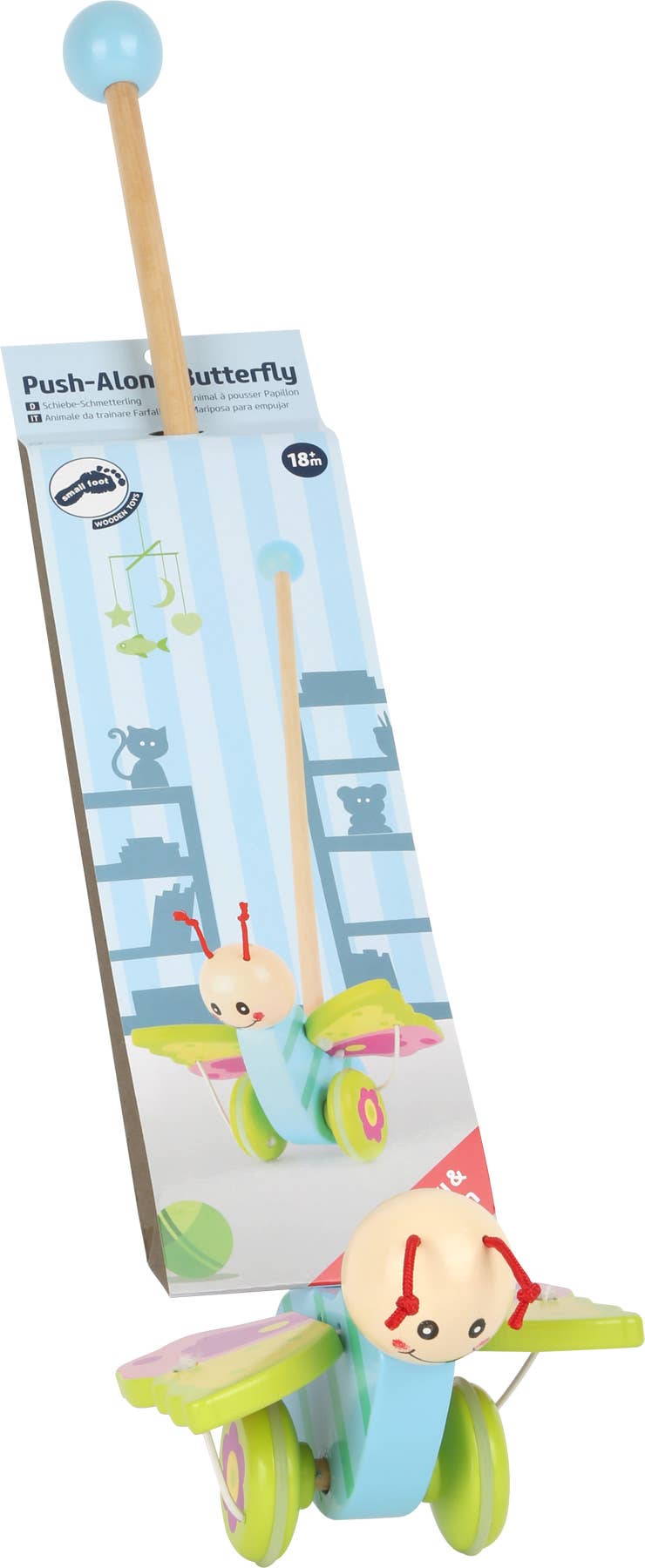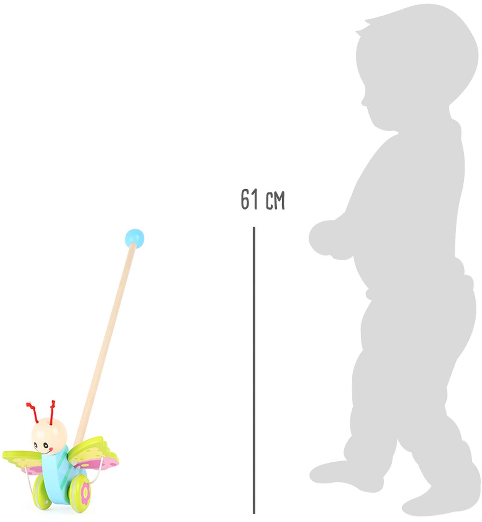 Flyga fjäril, flyga! Barnrummet kan underbart utforskas med detta push-djur. När du vrider hjulen fladdrar fjärilen sina vingar runt. Den glidande fjärilen är gjord av robust trä och det praktiska handtaget ger ett bra grepp när du trycker på. Hjulen är utrustade med en gummibeläggning, vilket garanterar en tyst och säker glidning över golvet. Ett måste för varje barns rum!