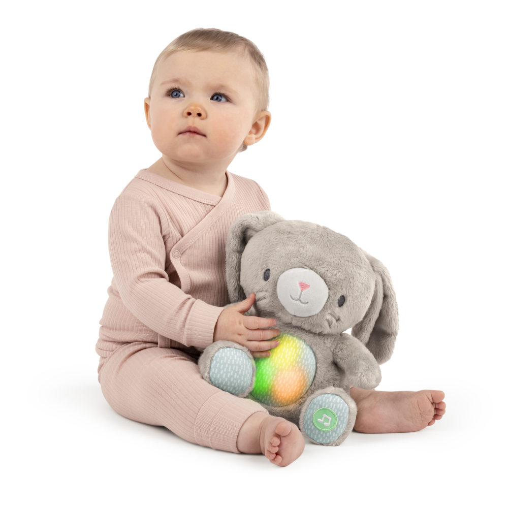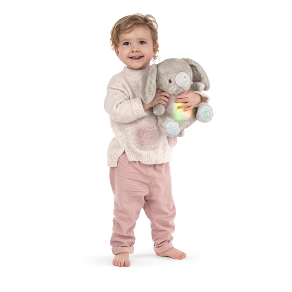 Med mjuka pulserande ljus i Sylvi-kaninens mage blir leksaken både underhållande och engagerande. Barnet kan aktivera ljus och ljud genom att skaka leksaken eller klämma Sylvis fot, vilket främjar utvecklingen av grovmotoriska färdigheter. Välj mellan två lägen: kontinuerlig uppspelning eller korta stötar av vibrationer, ljus och ljud.