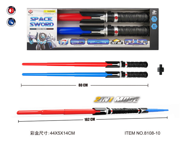 Rymdsvärd med teleskopfunktion så det kan bli mellan 43-80 cm, går även att sätta ihop båda till ett enda långt svärd som då blir 162 cm. Svärden har både ljus och ljud. I paketet ingår 1 röd och 1