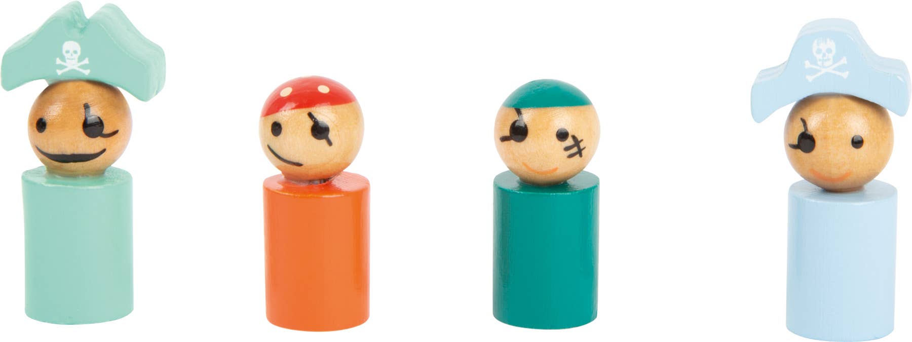 Buccaneers se upp! Denna trä Ludo ger pirat kul till spelbrädet. Målet är att få hans piratgäng helt på piratskeppet först. Kuben anger med hur många utrymmen en spelpjäs kan gå framåt. Räkning övas på ett lekfullt sätt. De barnvänliga karaktärerna utarbetas i detalj. Vilken buccaneer tar de andra på knäna Denna klassiska Ludo i en trendig design och kompakt format borde inte saknas i något barns rum!