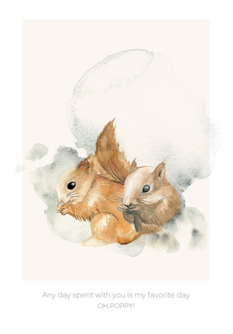 Oh Poppy presenterar en charmig poster som kommer att pryda barnrummet med sitt söta motiv av två små ekorrar. Denna poster bär budskapet ”Any day spent with you is my favorite day” och skapar en varm och inbjudande atmosfär. Perfekt för att ge rummet en personlig touch.