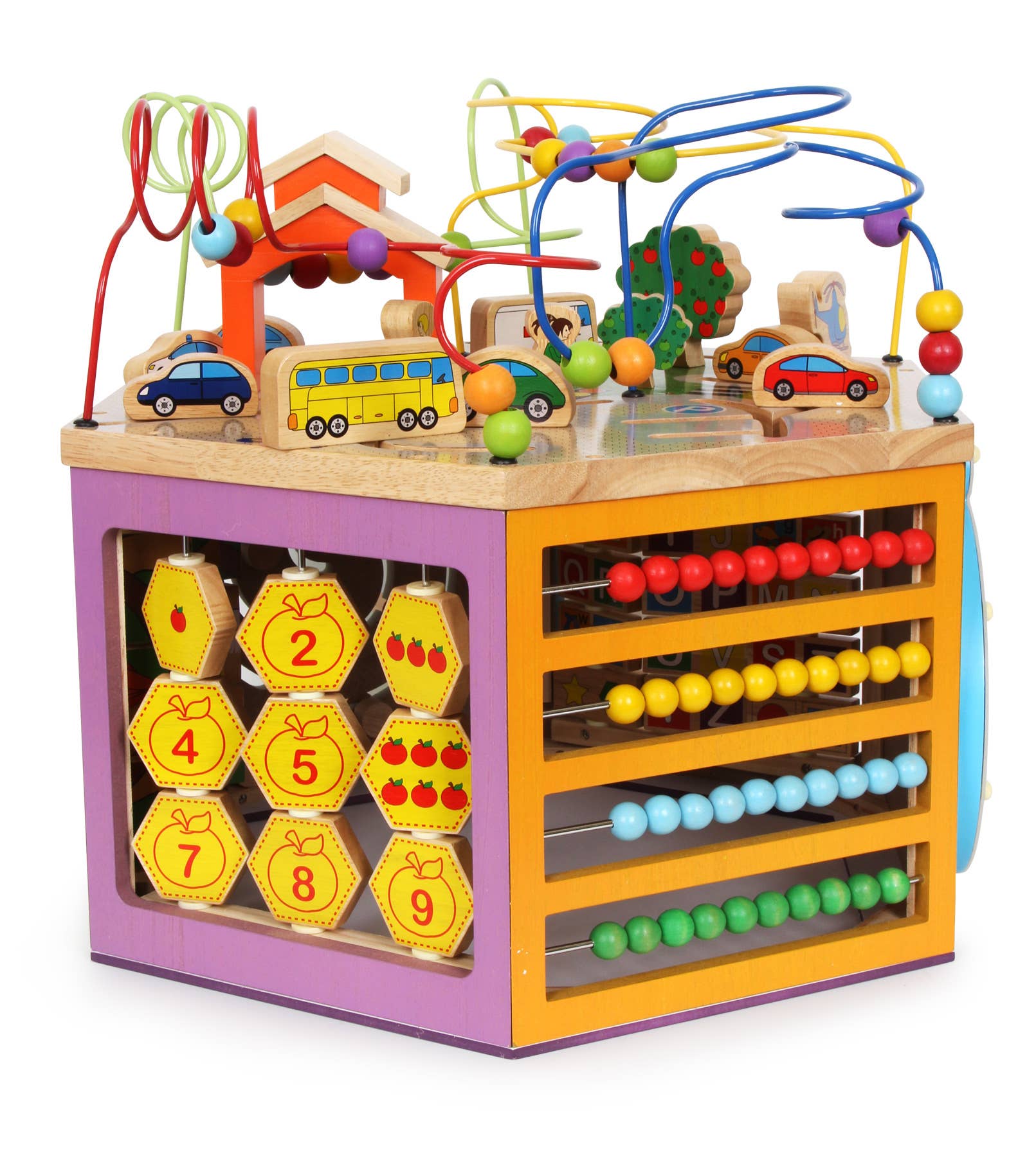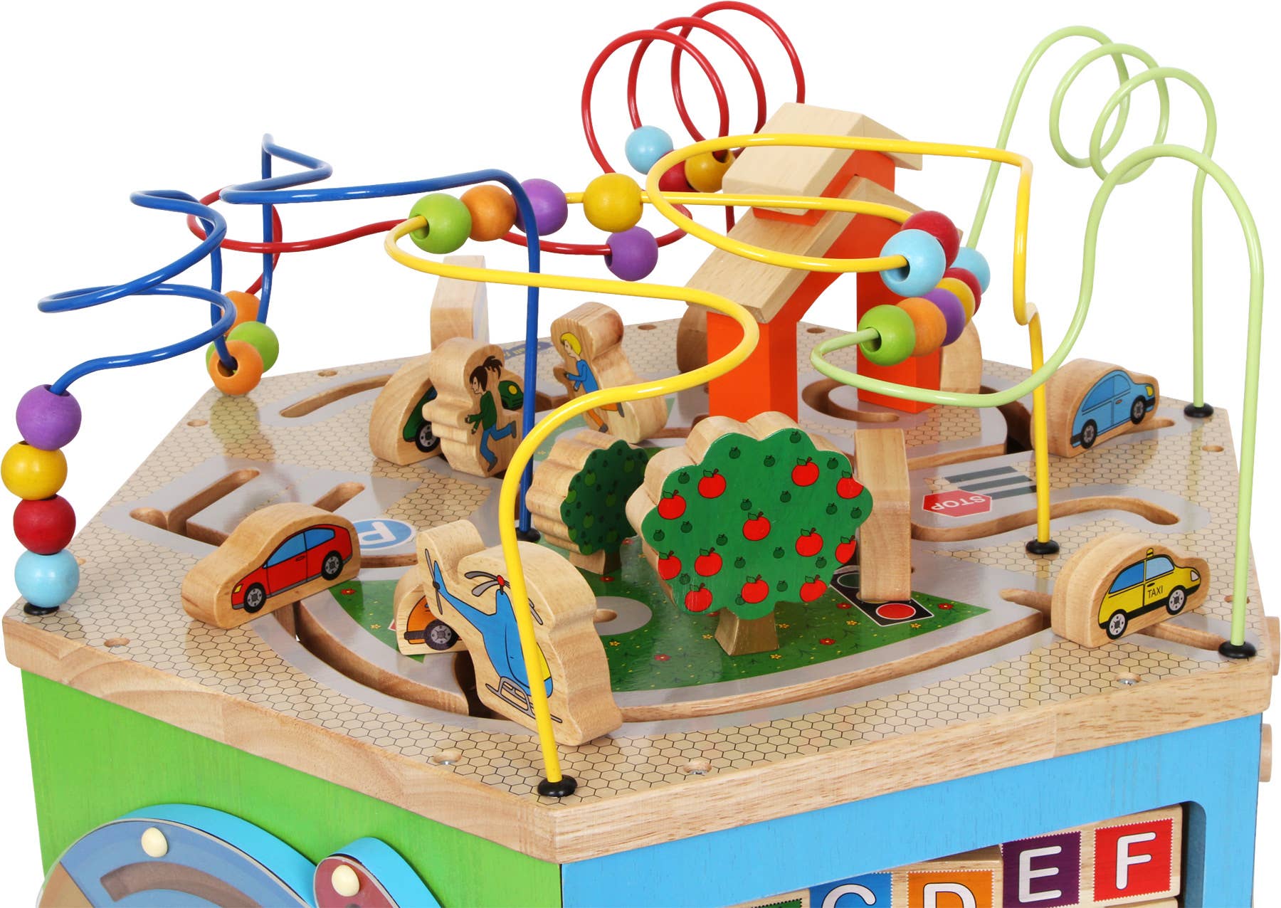 Låt oss gå på en upptäcktsresa! Denna färgglada trämotoriska kub erbjuder ett brett utbud av spelalternativ på sju sidor. Förutom motoriska slingor, pussel, labyrinter och skjutspel kan de små lära sig alfabetet och fördjupa sin förståelse för siffror samtidigt. Denna detaljerade spelkub erbjuder småbarn variation och garanterar timmar av kul. Tristess har ingen chans.