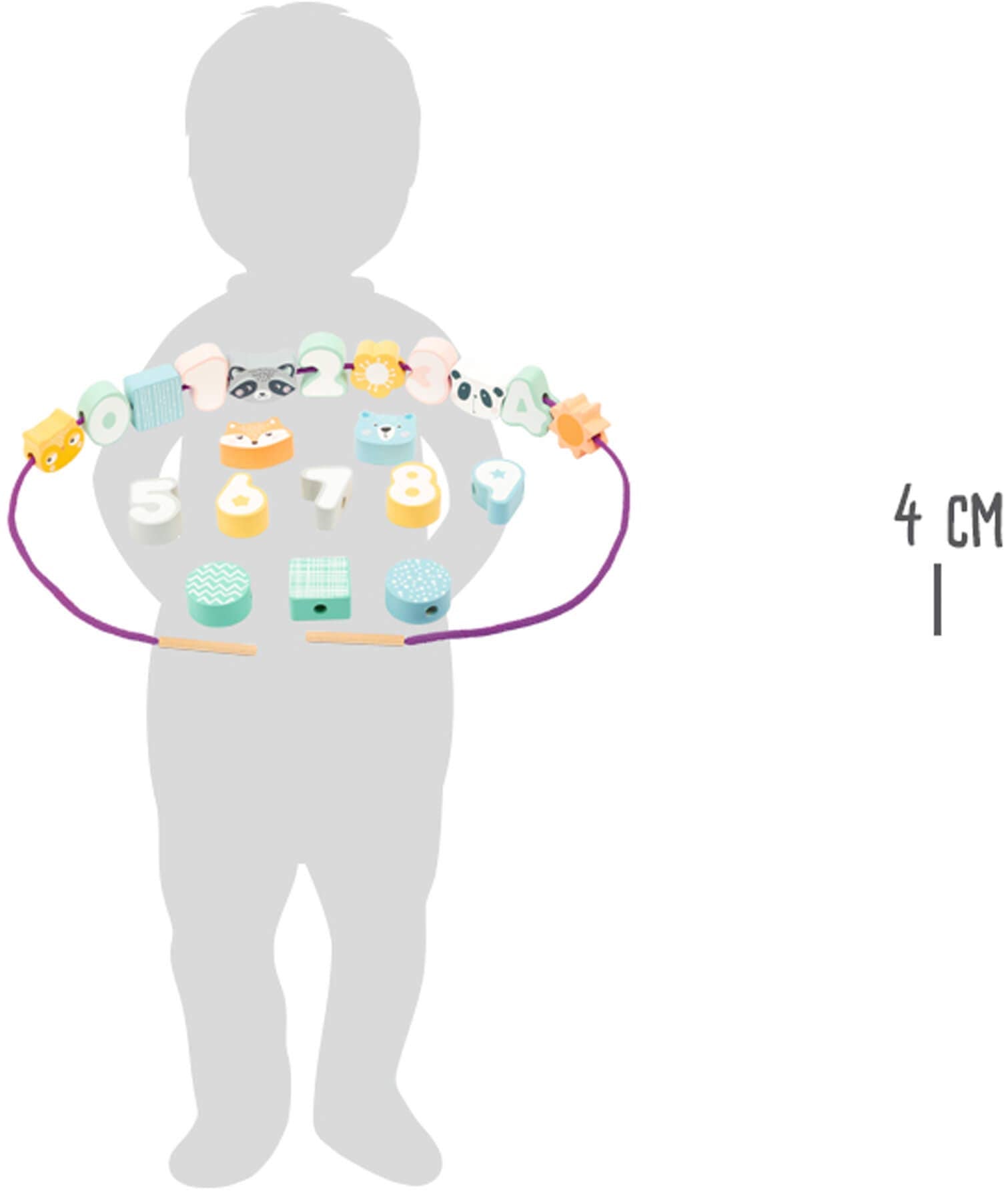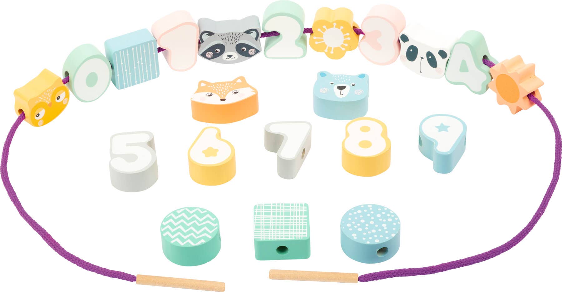 Roligt gäng spel med djur och siffror! Syftet med detta trägängningsspel är att trä siffrorna från 0-9 i rätt ordning. Koncentration och skicklighet krävs från de små gängkonstnärerna! Olika djur och former i ett modernt pastellutseende kan strängas på efter önskemål. En vacker koncentration spel i ett modernt utseende med garanterat kul.