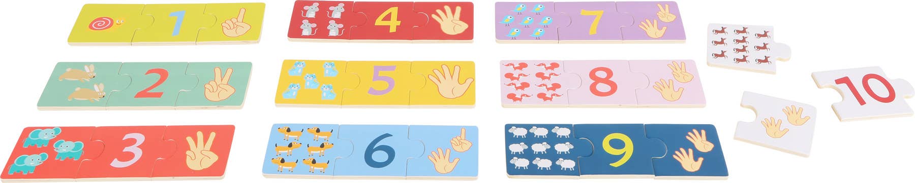Kom igen, låt oss lära oss att räkna! Detta fantastiska träinlärningspussel hjälper små aritmetiska rävar att upptäcka nummervärlden och öva på att räkna. Tre delar med respektive nummer måste alltid sättas ihop. Pusslet kan också användas som ett memo-spel. De robusta, kärleksfullt målade trädelarna representerar siffrorna från 1 till 10 i tre varianter och främjar också koncentration och finmotorik. På detta sätt kan lärande kombineras med underhållande läggningskul. Placeringsspelet är bra för att memorera och öva!