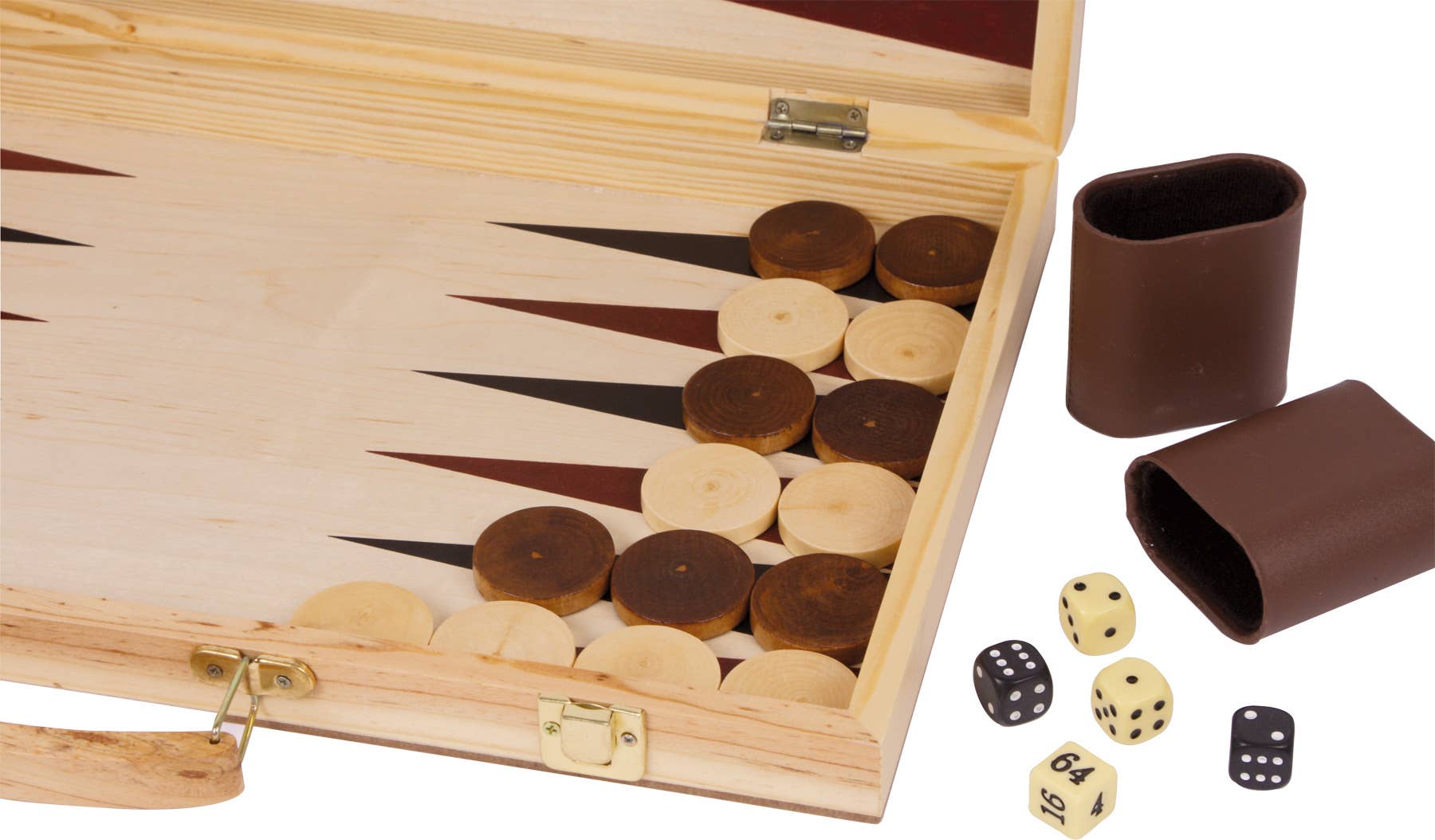 Högkvalitativt träfodral med inlägg i locket och med bärhandtag. De 3,8 x 0,7 cm bitarna gjorda av träskivor och figurerna på 3,5 till 7,5 cm gör att unga och gamla strateger glömmer tiden när det gäller schack, backgammon och pjäser!