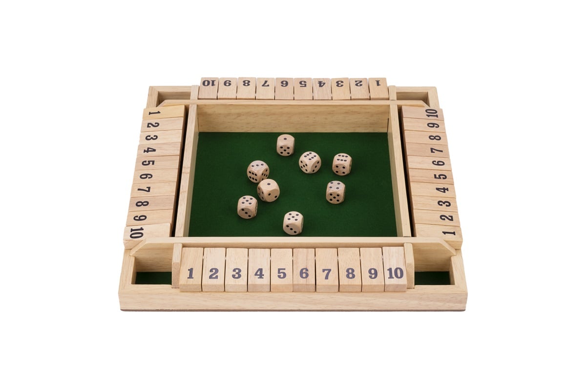 "Stäng lådan" innehåller åtta trätärningar, vilket gör det möjligt för upp till fyra spelare att delta samtidigt. Den robusta konstruktionen av både lådan och tärningarna säkerställer långvarig användning och nöje. Spelet levereras i en färgglad låda, vilket gör det till en utmärkt presentidé.