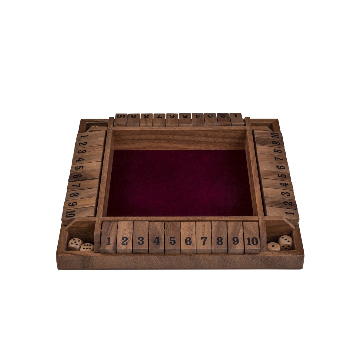 "Stäng lådan 4 spelare" kommer komplett med åtta trätärningar, vilket ger spelarna allt de behöver för att komma igång. Detta spel är inte bara ett nöje för spelare i alla åldrar, utan också en möjlighet att förbättra strategiskt tänkande och matematiska färdigheter. Den robusta konstruktionen av trätärningarna och lådan säkerställer långvarig användning och hållbarhet.