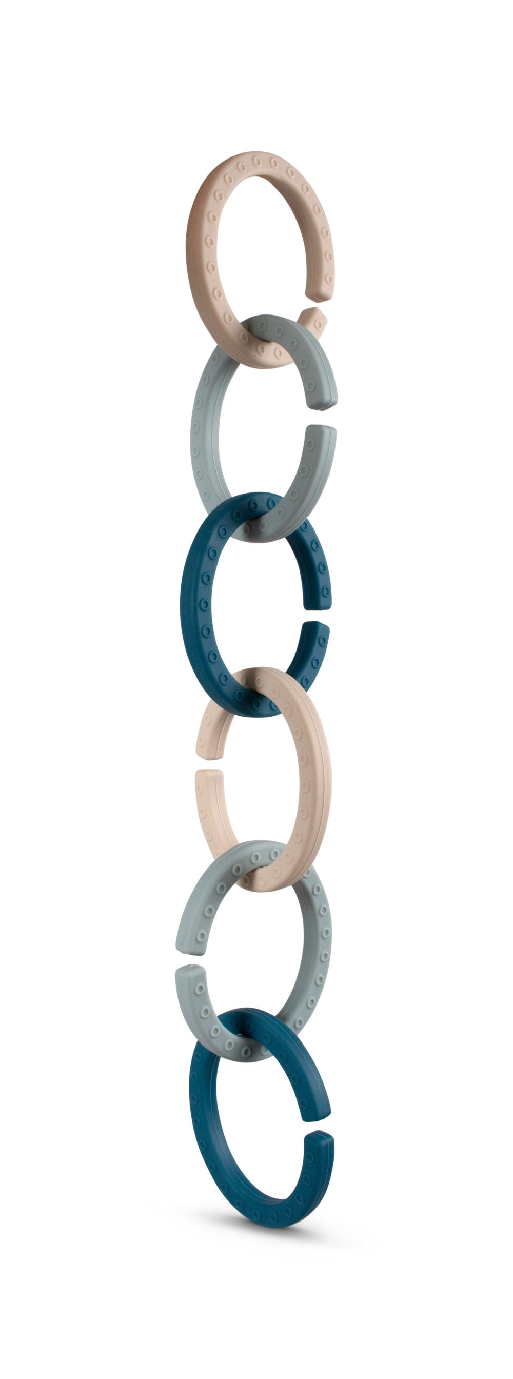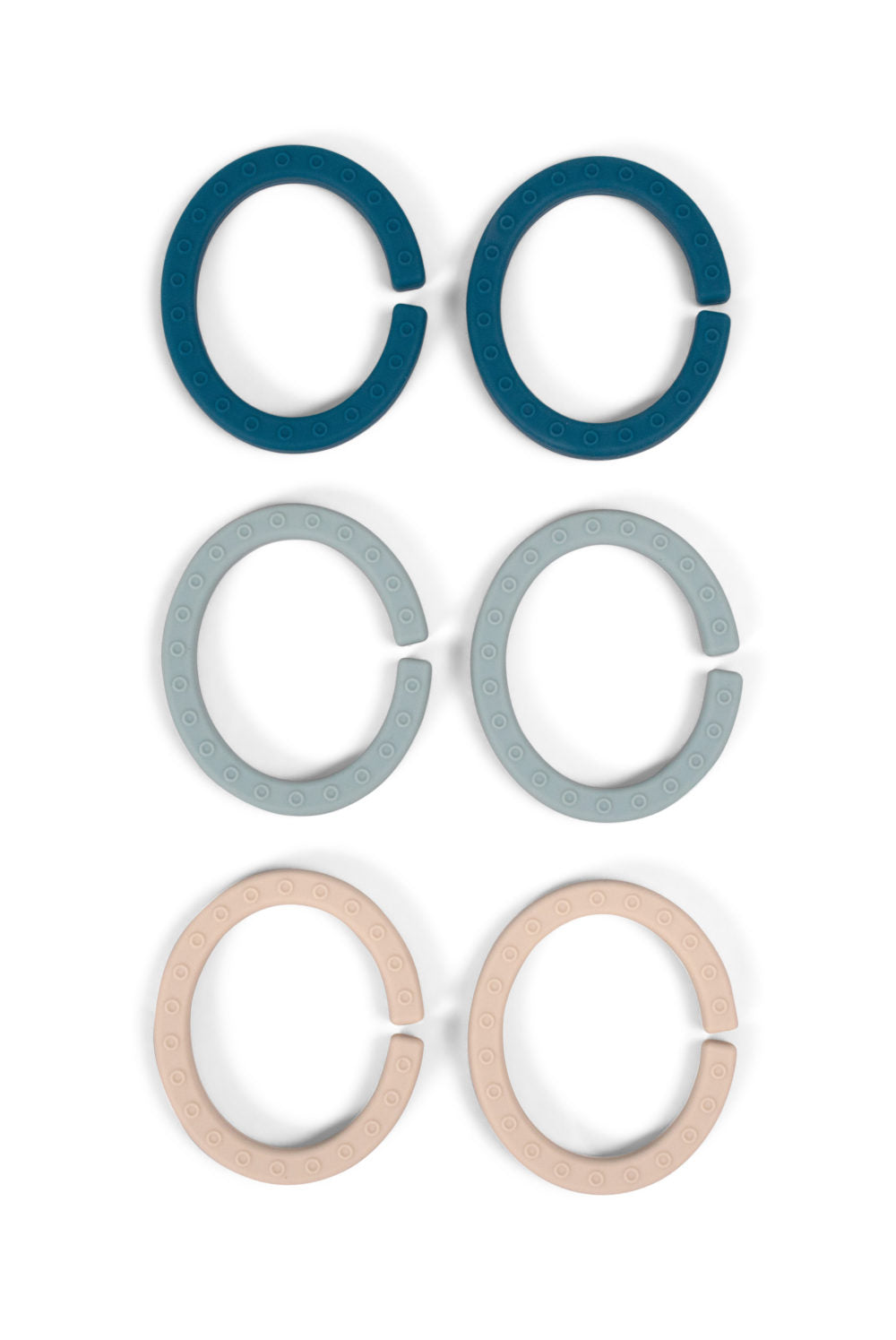 Setet består av sex ringar som kan länkas samman för att föra leksaken närmare ditt barn. En enskild ring fungerar även utmärkt som en bitvänlig leksak. De mjuka och flexibla aktivitetsringarna är tillverkade av hållbar och supermjuk silikon, vilket gör dem enkla att rengöra i diskmaskinen.