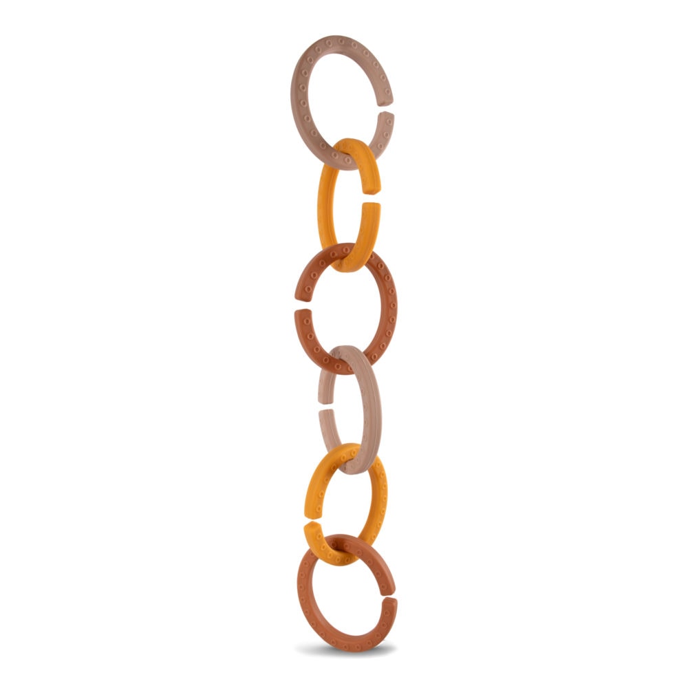 Setet består av sex ringar som kan länkas samman för att föra leksaken närmare ditt barn. En enskild ring kan också användas som en trevlig bitring. De mjuka och flexibla aktivitetsringarna är tillverkade av hållbar och supermjuk silikon.
