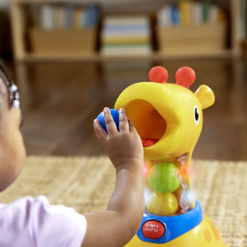 Bright Starts presenterar Spinnin’ Spots Giraffe, en leksak som garanterar skratt och lek. Denna oemotståndliga giraff håller ditt barn engagerat och i rörelse. Små barn kan släppa bollar i giraffens mun för att aktivera musik och ljus. När ditt barn trycker på knappen eller slår på rullen, startar över 60 roliga ljud och melodier som får skrattet att flöda.