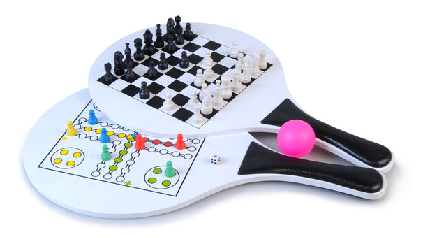 Strandtennis-set i trä med tryckta spelplaner på racketen. Fia/schack för dig som inte bara vill ligga och lata dig i solen! Boll och spelpjäseringår. Storlek: 38 × 24 cm.