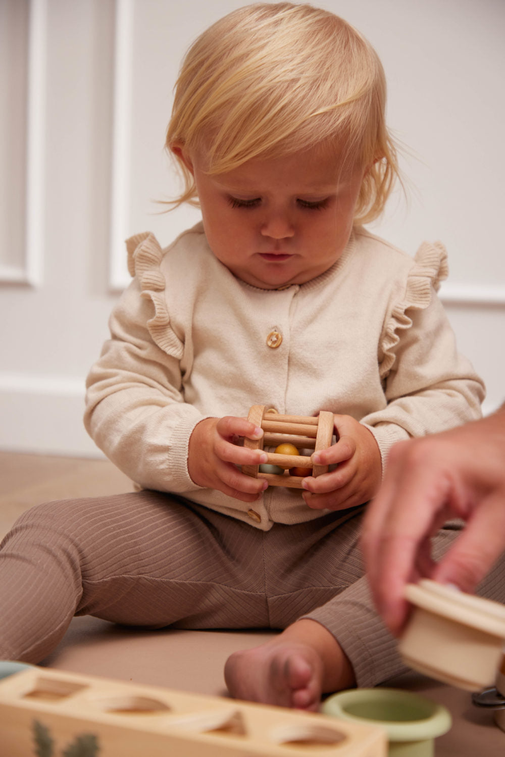 Filibabba erbjuder en charmig leksaksväska fylld med sensoriska leksaker som låter ditt barn utforska ljud, färger och spännande ytor. Väskan innehåller fyra sensoriska leksaker tillverkade i bokträ, medan själva väskan är gjord av papper och kartong. Den är dekorerad med vårt söta Chestnuts-tryck med färgglada löv.