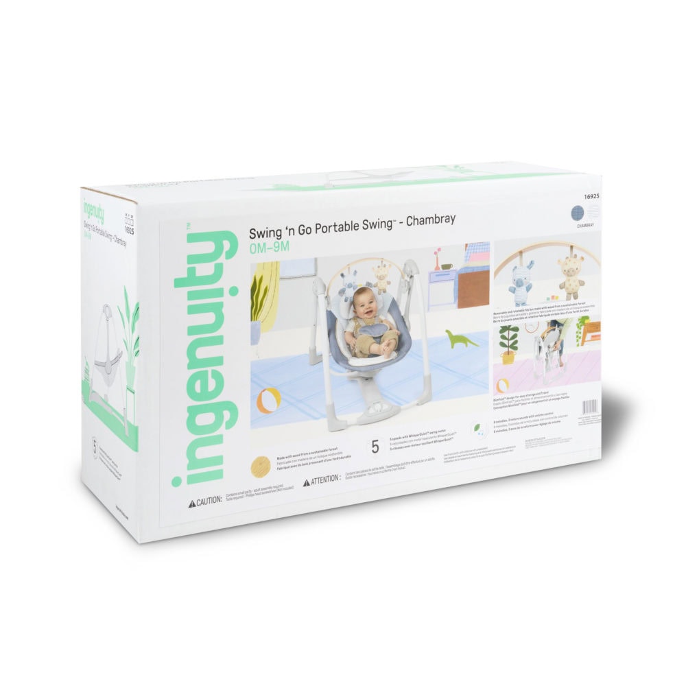 Med en SlimFold-design är gungan lätt att fälla ihop för enkel förvaring. Den är utrustad med en 5-punkts säkerhetssele för att hålla barnet tryggt. Ingenuity Swing 'n Go Portable Swing - Chambray är en perfekt present för den stilmedvetna föräldern och bebisen.