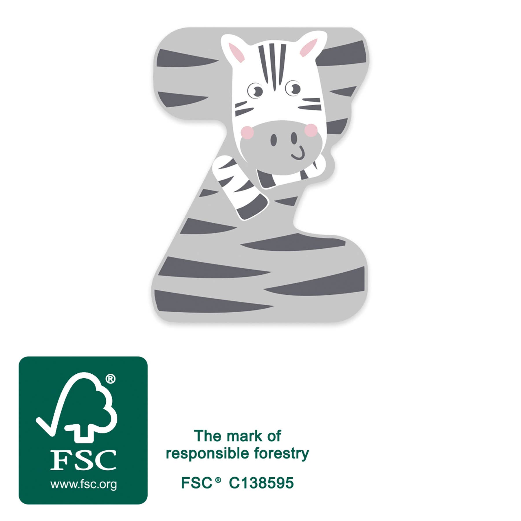 Set med 6 Z för zebra! Animal letter fun garanteras med dessa ABC-bokstäver gjorda av FSC® 100% certifierat trä, tilltalande för barn. Tillsammans kan djurbokstäverna användas för att sätta ihop namn, förkortningar eller ord individuellt. Perfekt för små nybörjare och även ett trevligt blickfång som dörrbrev till barnrummet. Varje bokstav är märkt med ett djur som matchar dess första bokstav i det tyska namnet. Rundade kanter ger bokstäverna en behaglig känsla. Enskilda bokstäver, ord eller fraser: träbokstäver är riktiga klassiker för att dekorera barnrum.