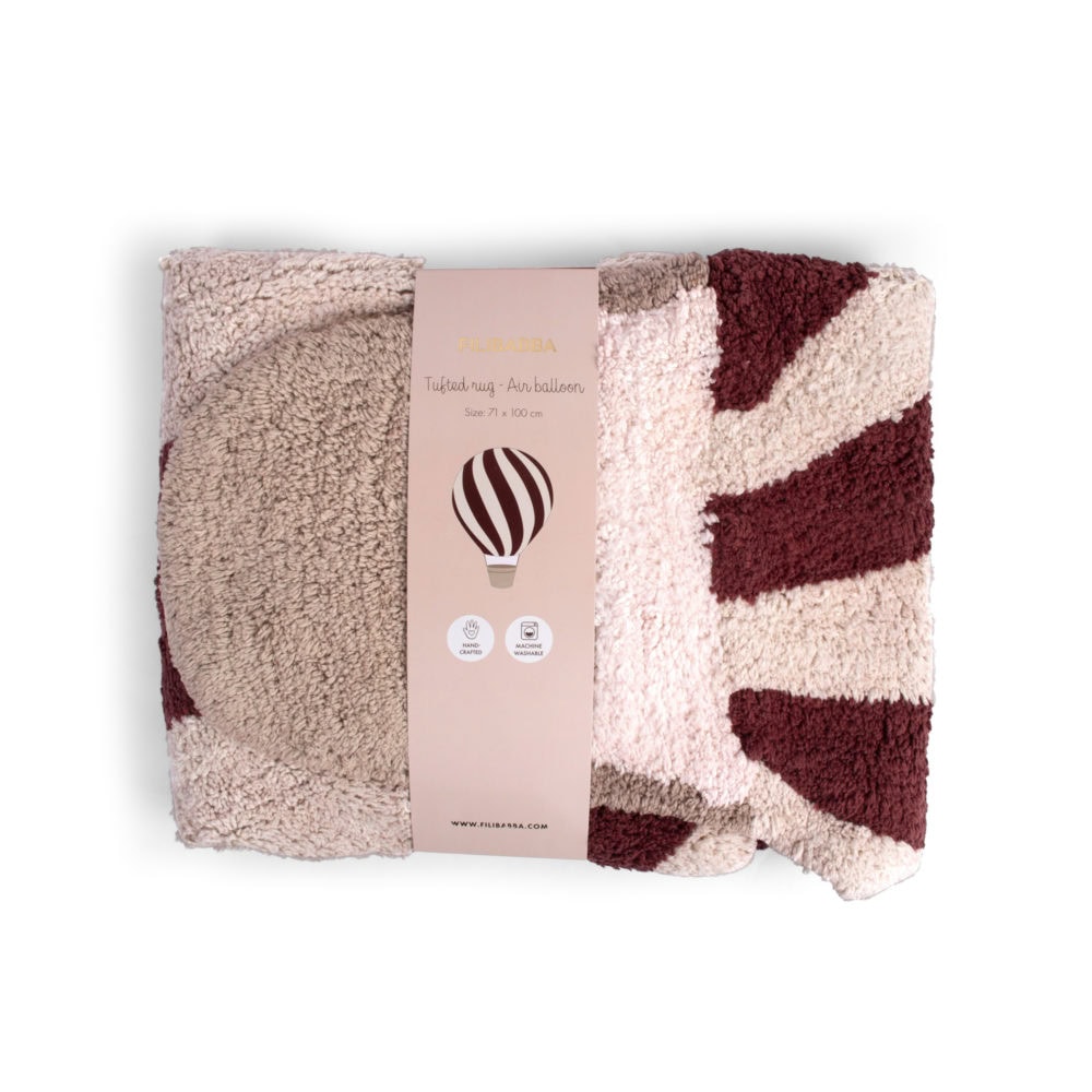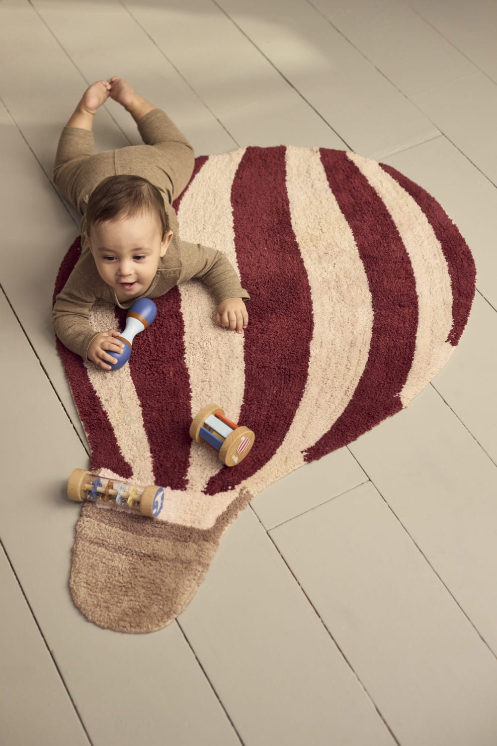 Den klassiska FILIBABBA luftballongen i en djupröd design ger tidlös charm till barnets rum. Den lekfulla ballongmotivet väcker en känsla av förundran och inbjuder de små att drömma om svävande äventyr och magiska resor. Mattan är både dekorativ och praktisk, perfekt för lekytor eller kalla golv.