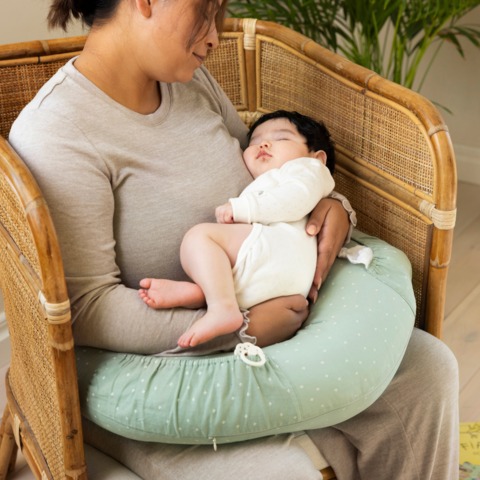 Amningskudden är utrustad med två stora fickor där du enkelt kan förvara napp, snutte eller nappflaska. Detta gör att du alltid har viktiga tillbehör nära till hands under amningsstunden. Knytbanden säkerställer att kudden håller sig på plats.