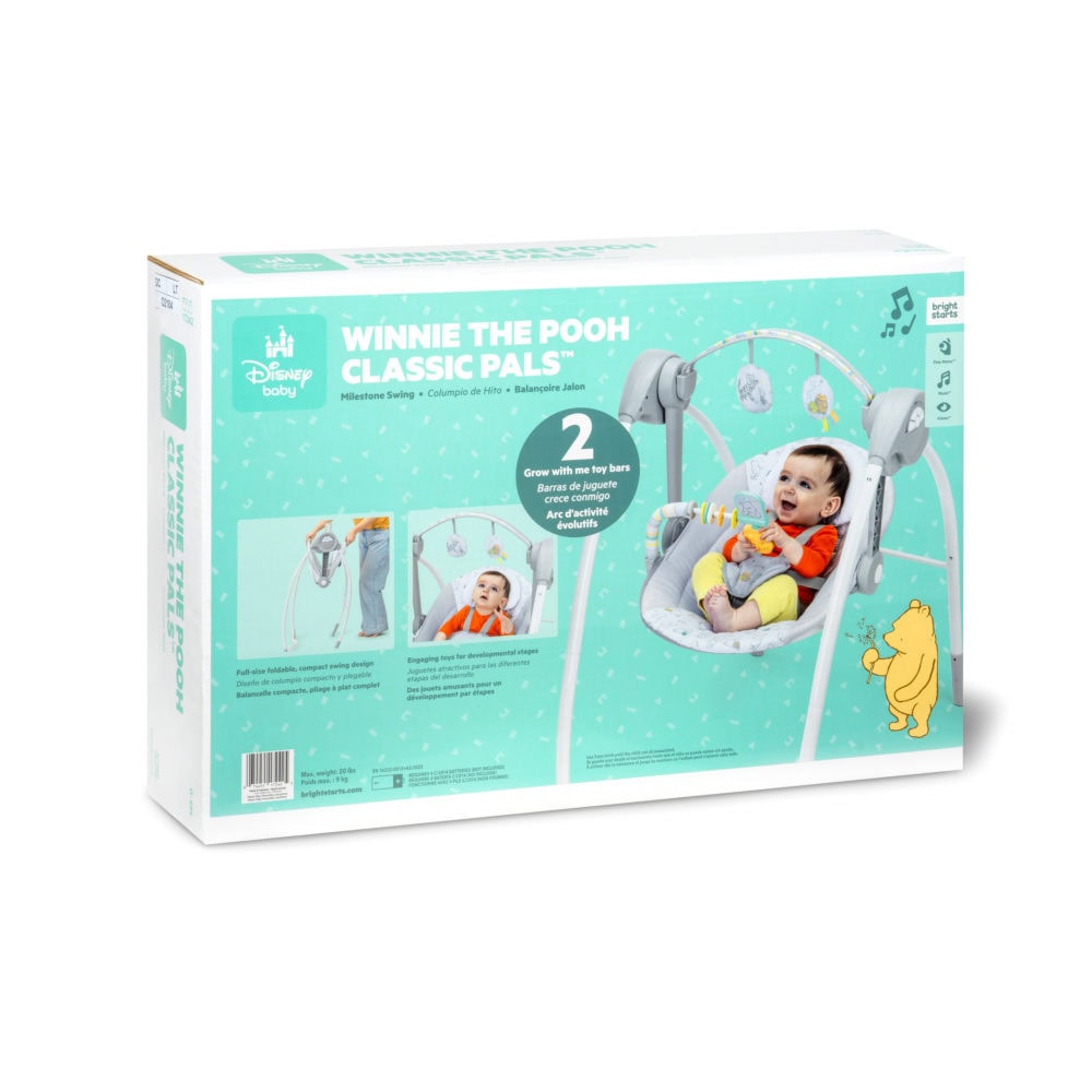 Bright Starts Disney Baby Winnie the Pooh Classic Pals Milestone Swing är en perfekt följeslagare för både nyfödda och aktiva upptäckare. Denna gunga erbjuder två olika stadier av lek, från att nå och slå till mer avancerad lek. Yngre barn kan titta upp och nå efter de hängande Tigger- och solplyschleksakerna på den övre leksaksbågen.